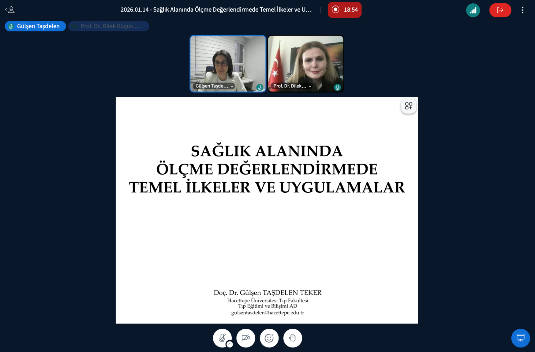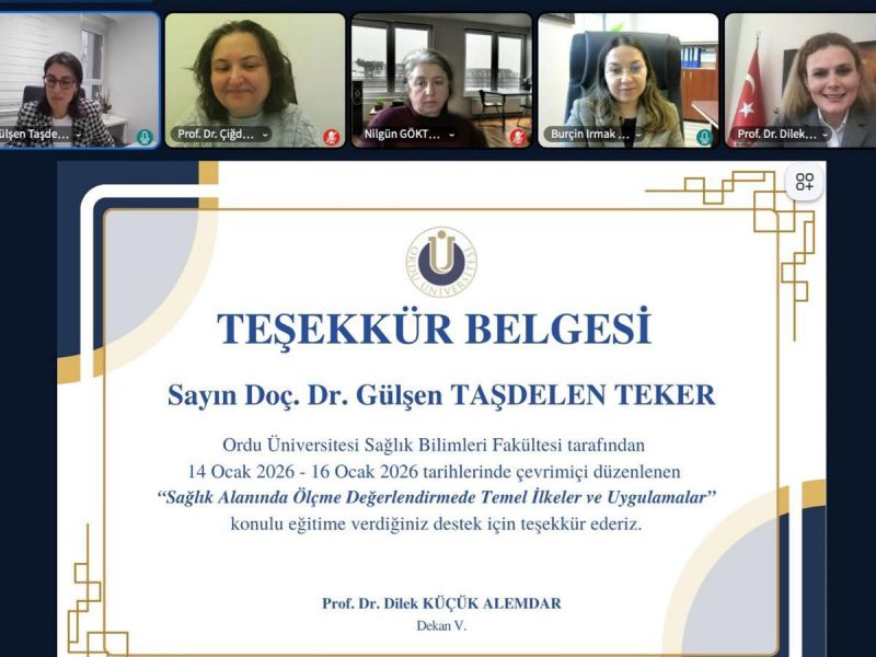 Fakültemiz tarafından 14 ve 16 Ocak 2026 tarihlerinde “Sağlık Alanında Ölçme ve Değerlendirmede Temel İlkeler ve Uygulamalar” başlıklı çevrimiçi etkinlik düzenlenmiştir. Eğitim, Hacettepe Üniversitesi Tıp Fakültesi Tıp Eğitimi ve Bilişimi Anabilim Dalı öğretim üyesi Doç. Dr. Gülşen Taşdelen Teker tarafından gerçekleştirilmiştir. Etkinlik kapsamında sağlık alanında ölçme ve değerlendirmeye ilişkin temel kavramlar ele alınmış; ölçme araçlarında aranan özellikler, geçerlik ve güvenirlik konuları ayrıntılı olarak değerlendirilmiştir. Programda çoktan seçmeli madde analizi ve madde hazırlama ilkeleri açıklanmış, bilgi ve performans ölçümünde kullanılabilecek ölçme araçlarına ilişkin kapsamlı bir değerlendirme sunulmuştur. Katılımcılar, ölçme ve değerlendirme süreçlerinin sağlık alanındaki eğitim ve uygulamalardaki yeri ve önemine ilişkin görüşlerini paylaşma fırsatı bulmuştur. Bu değerli bilgi paylaşımı için, Doç. Dr. Gülşen Taşdelen Teker’e, etkinliğin düzenlenmesini sağlayan hocalarımıza ve katılım sağlayan tüm akademisyenlere teşekkür ederiz.