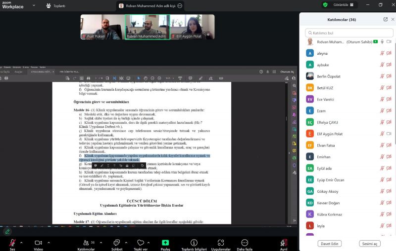 Fizyoterapi ve Rehabilitasyon Bölümü Uygulamalı Eğitimler Komisyonu, 2. sınıf öğrencilerine yönelik “Uygulamalı Eğitimler Yönergesi” bilgilendirme toplantısını 28 Ocak 2026 tarihinde çevrim içi ortamda gerçekleştirdi. Komisyon Başkanı Dr. Öğr. Üyesi Rıdvan Muhammed Adın’ın sunumu ile yönergenin temel ilkeleri, uygulama basamakları ve süreçte dikkat edilmesi gereken noktalar öğrencilere aktarıldı. Soru-cevap bölümünde öğrencilerin merak ettikleri konular ele alındı. Etkinliğe bölüm öğretim elemanları da katılarak bilgilendirme sürecine destek verdi. Toplantıya katılım sağlayan tüm öğrencilerimize ve öğretim elemanlarımıza teşekkür ederiz.